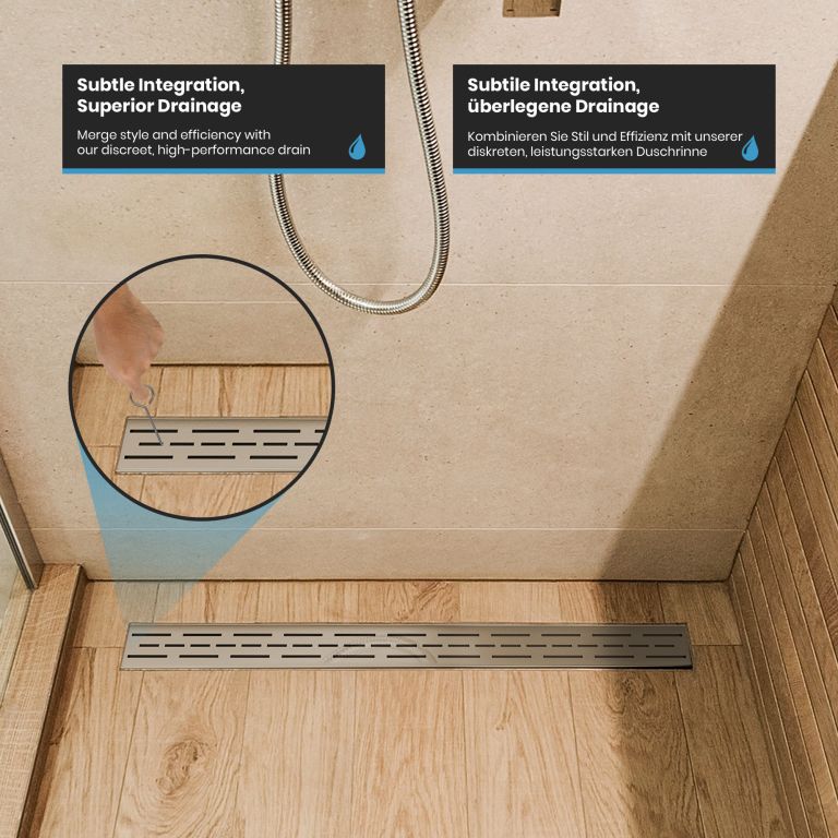 Proměňte svou koupelnu v oázu stylu a inovací díky našim vynikajícím lineárním sprchovým odtokům. Nerezová ocel nejvyšší kvality, umně kartáčovaná, v kombinaci s pískovaným hlavním tělem. Design vaší koupelny si zaslouží něco výjimečného, proto jsou naše sprchové odtoky navrženy tak, aby nejen zaujaly, ale také inspirovaly svou odolností. Díky zapuštěnému povrchovému materiálu vám zaručujeme výrobek, který obstojí ve zkoušce času. Instalace je rychlá, nekomplikovaná a bez nutnosti použití baterií. Mysleli jsme na vše, abyste se mohli bez obav soustředit na to podstatné. Vylepšete tvar a funkci svého sprchového koutu pomocí našeho elegantního a odolného lineárního sprchového odtoku, který dodá vaší každodenní rutině sofistikovanost.
