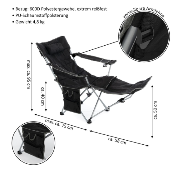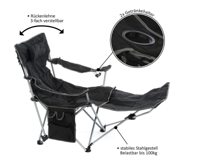 Kempingová židle nebo kempingové lehátko - vyberte si. S touto kempingovou židlí můžete sedět v uvolněné poloze celé hodiny nebo si lehnout a luxusně si odpočinout. Židle je sklopná a snadno přenosná, rychle připravená k použití a stejně rychle znovu zabalená. Díky praktické odolné brašně lze židli vzít kamkoliv. Dva integrované držáky nápojů v područkách skládací židle lze zakrýt, když se nepoužívají, a nabízejí velmi užitečnou možnost uložení nejen plechovek a lahví, ale také příslušenství, jako je např. mobilní telefon. Kromě toho je na boční straně židle praktická úložná kapsa na zip a 3 kapsy.