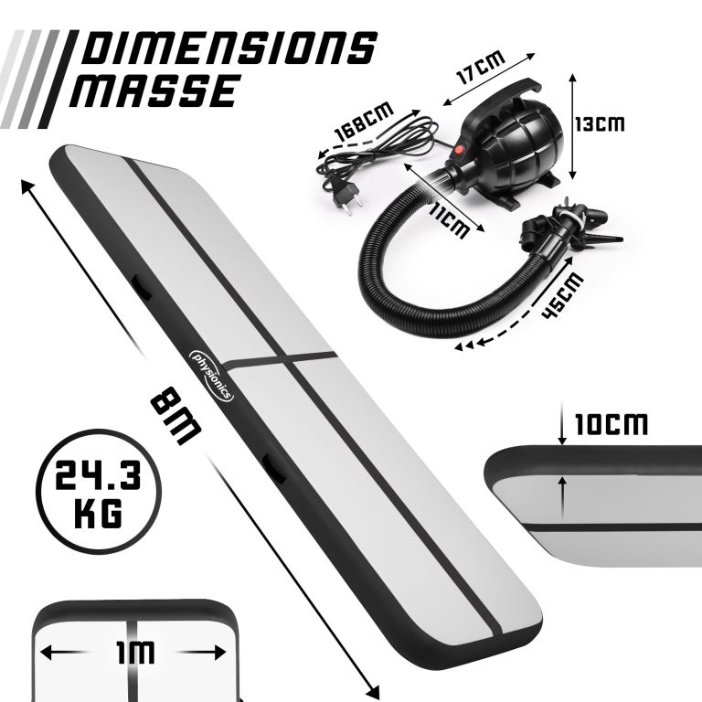 Podložka je vyrobena z odolné PVC plachty s dvojitou stěnou, která zajišťuje pevnost a stabilitu i při intenzivním používání. Díky tloušťce 10 cm je ideální pro bezpečné dopady a skoky. Snadná montáž pomocí elektrické pumpy, jednoduchá údržba a dlouhá životnost – to vše ocení každý sportovec.