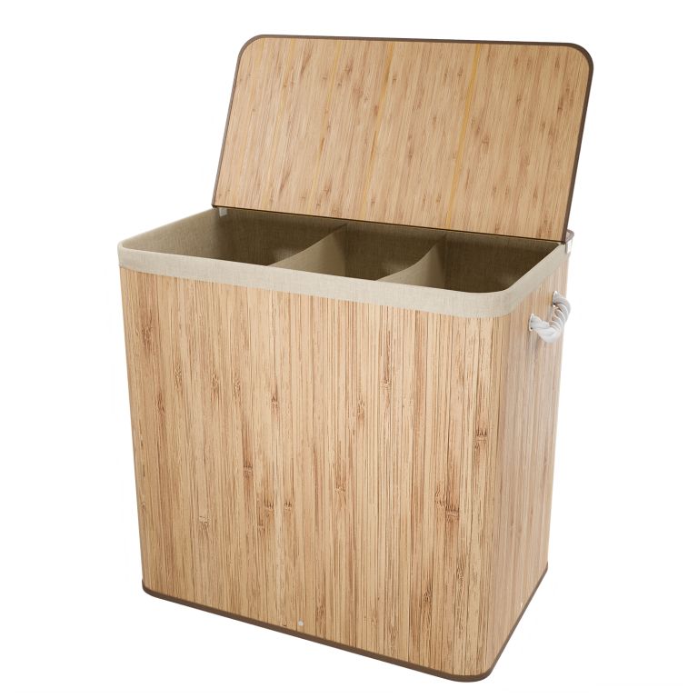 Vneste do své domácnosti pořádek a styl s bambusovým košem na prádlo o objemu 150 litrů. Díky svému přírodnímu vzhledu se stane elegantním doplňkem koupelny či ložnice a zároveň skrytým úložným prostorem pro veškeré prádlo. Tři oddělené přihrádky umožňují okamžité třídění bílé, tmavé a barevné, takže praní bude rychlejší a přehlednější.