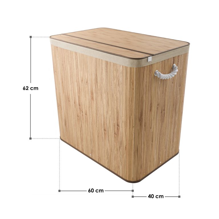 Koš je vyroben z odolného bambusu a doplněn textilním vakem, který lze snadno vyjmout a vyprat. Pevné madlo umožňuje pohodlné přenášení k pračce a víko udržuje prádlo diskrétně skryté i bez nežádoucích pachů. Díky svému objemu a kvalitnímu provedení je ideální volbou pro rodiny i náročnější domácnosti.